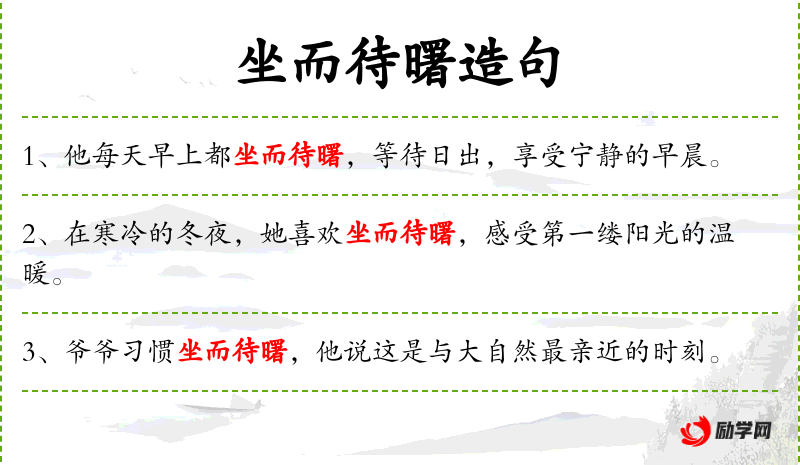 - 谓语:坐而待曙,等待日出,享受宁静的早晨