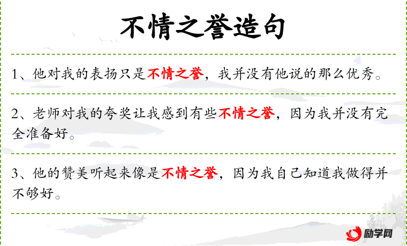 - 不情之誉: 同义词(过誉、名不副实);反义词(实至名归)