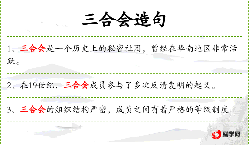 1. 【三合会】 天地会的别名。天地会以反清复明为宗旨,相传以洪武(明太祖年号)的洪字为其代称,对内称"洪门",会员互称"洪家兄弟"。因洪字有三点水偏旁,故又称"三点会"◇嫌只取左偏,偏而不全,不吉祥,故又取右偏"共","共"有会合之义,因改称"三合会"。