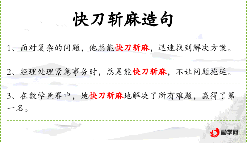 成语:快刀斩麻,源自古代,比喻处理问题果断迅速。 文化意义**:强调效率和果断性在教育工作中的重要性。