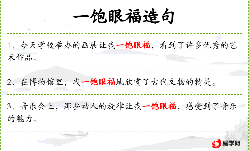 - 一饱眼福:成语,意思是充分欣赏到美好的事物。