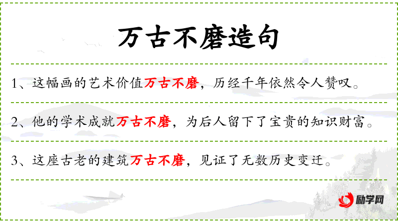 1. 【万古不磨】 万古:永远;磨:磨灭,消失。永远不会消失。
