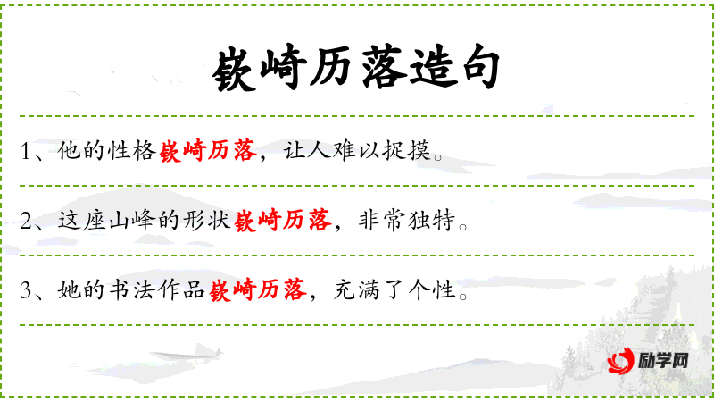 - 嵚崎历落:形容线条曲折、不规则,具有艺术美感。