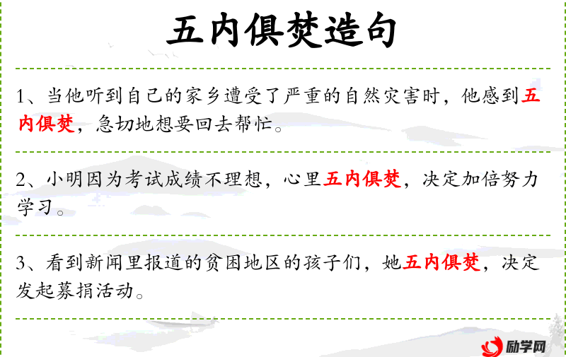 - 心五内俱焚:形容内心极度痛苦和焦虑。