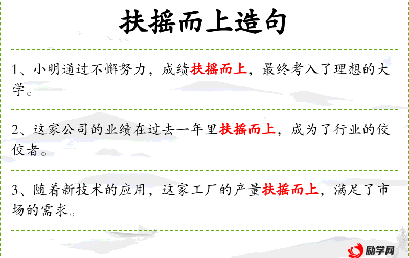 - 扶摇而上:成语,形容事物迅速上升或发展。