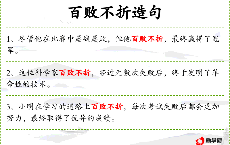 9. 【百败不折】 折:屈服。即使失败100次也绝不屈服。形容意志坚强。