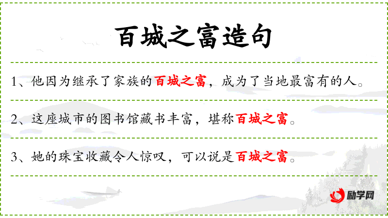 1. 【百城之富】 - 形容藏书极多,似拥有许多城市那样富有。