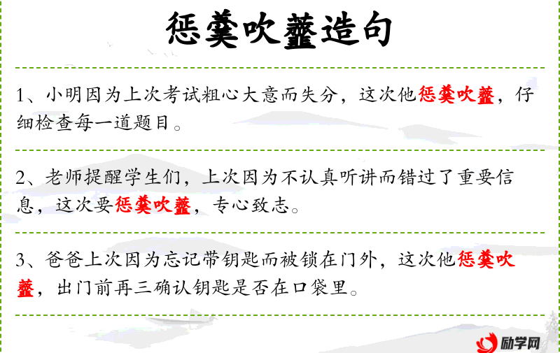 句子中的“惩羹吹虀”是一个成语,源自古代的故事,反映了人重视从经验中学*的文化特点。这个成语的使用增加了句子的文化深度。