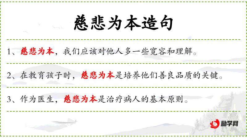 1. 【慈悲为本】 慈悲:慈善和怜悯。原佛教语,以恻隐怜悯之心为根本。