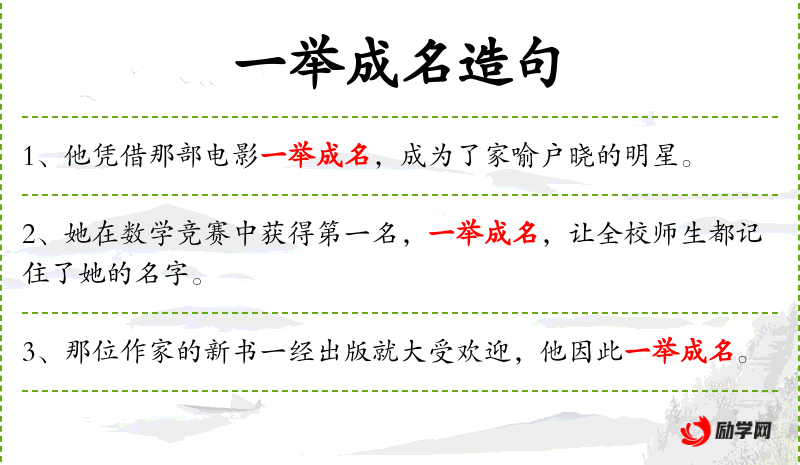 1. 【一举成名】 - 原指一旦中了科举就扬名天下。后指一下子就出了名。
