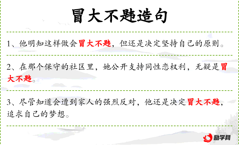 - 状语:尽管知道会遭到家人的强烈反对,冒大不韪