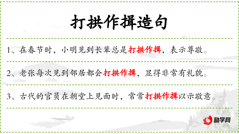- 文化意义:打拱作揖是中华文化中的一种传统礼节,体现了对长辈的尊敬和孝顺。
