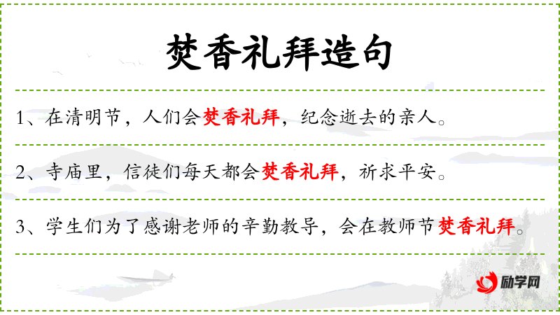 4. 【焚香礼拜】 - 焚香:点燃香火;礼拜:向尊敬的人或神灵行礼跪拜。烧香跪拜,以表尊敬服从之意。
