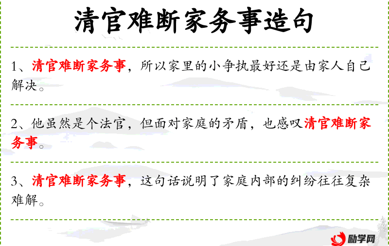 6. 【清官难断家务事】 再公正的官吏也很难论断家庭纠纷的是非曲直。指家庭内部的事,外人很难搞清楚。