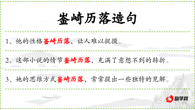 句子:“这部电影的叙事手法崟崎历落,给观众留下了深刻印象。”