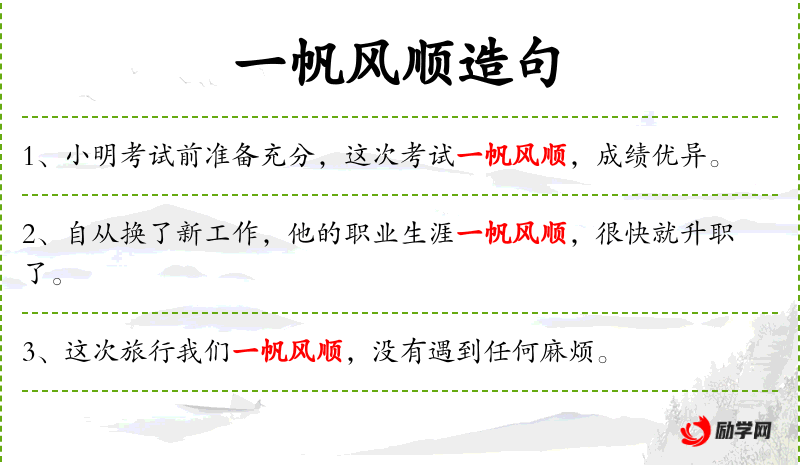 1. 【一帆风顺】 - 船挂着满帆顺风行驶。比喻非常顺利,没有任何阻碍。
