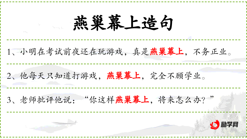 2. 【燕巢幕上】 - 燕子把窝做在帷幕上。比喻处境非常危险。