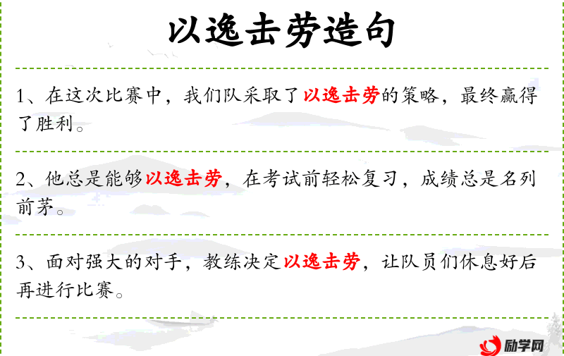 - 文化背景:在**文化中,成语“以逸击劳”常用来形容在竞争中利用对手的弱点或疲劳来取得优势。