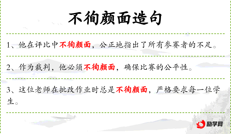 1. 【不徇颜面】 徇:曲从,偏私;颜面:面容,脸色。不曲从于别人的脸色。指不看别人的脸色行事。