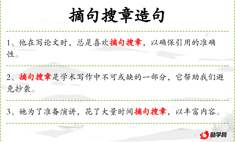- 摘句搜章:指的是在学术研究中引用他人的观点或文字。