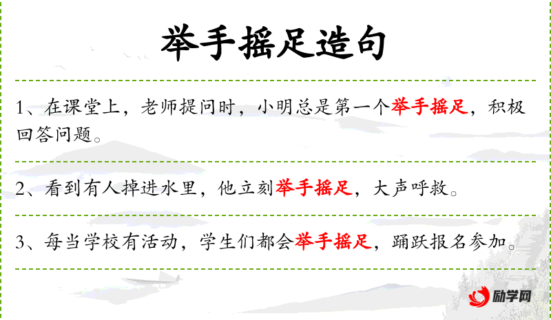 - 举手摇足:形容非常积极、热情的样子,通常用来描述参与或表达意愿的强烈。