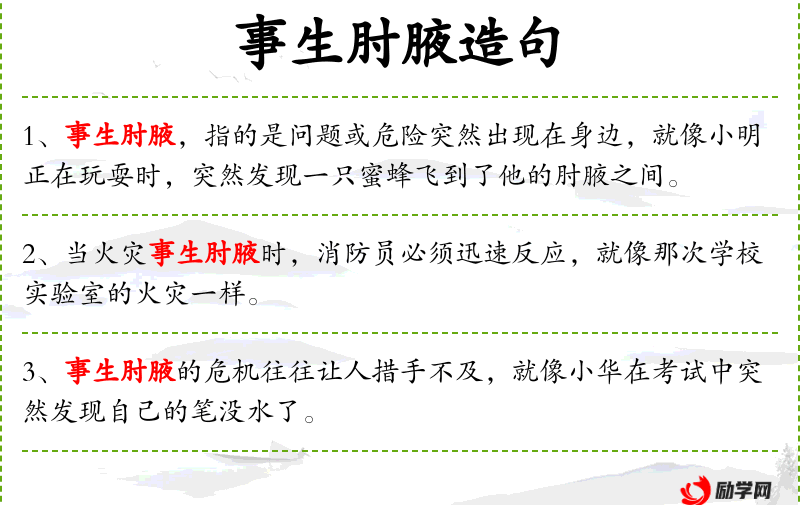 “事生肘腋”这个成语源自古代,形象地描述了危机发生在身边的情况。这个句子通过这个成语和考试中的具体情境,传达了文化中对危机处理的重视和应对突发的困难。
