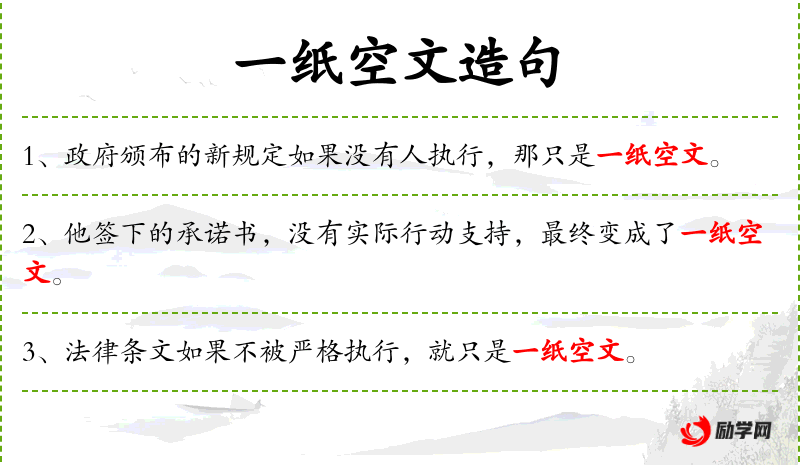 - 一纸空文:名词短语,比喻没有实际效果的文件或计划。