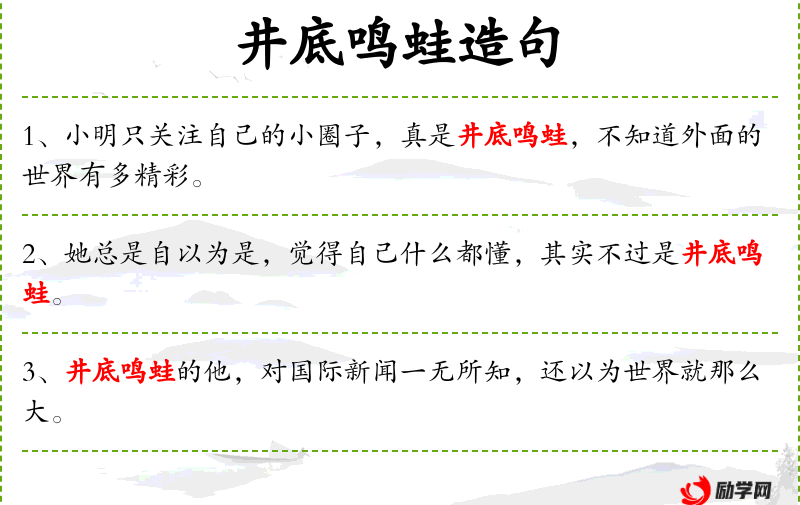 - “井底鸣蛙”是**传统文化中的一个成语,比喻见识狭隘的人。这个成语来源于《庄子·秋水》,讲述了井底之蛙的故事,强调了拓宽视野的重要性。