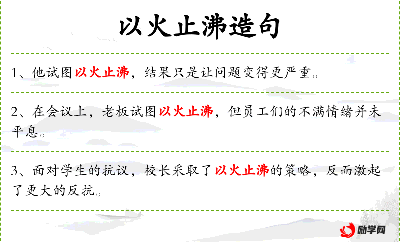 - 以火止沸:这是一个成语,比喻用错误的方法来解决问题只会使问题更严重。
