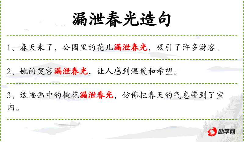 4. 【漏泄春光】 - 原指柳叶首先透露春天到来的信息,后比喻男女私情泄露,或秘密被察觉。