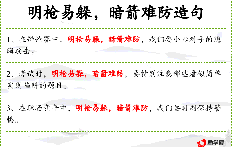 句子:“在职场竞争中,明枪易躲,暗箭难防,我们要时刻保持警惕。”