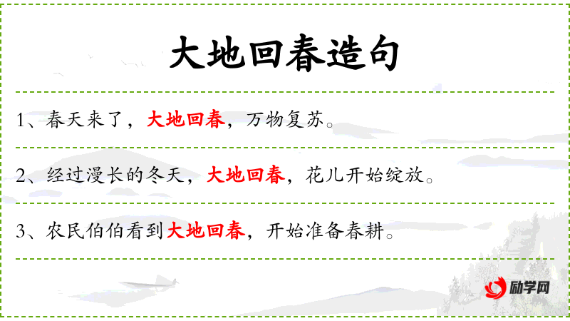 1. 【大地回春】 指冬去春来,草木萌生,大地上出现一片生机景象。有时亦用比喻形势好转。