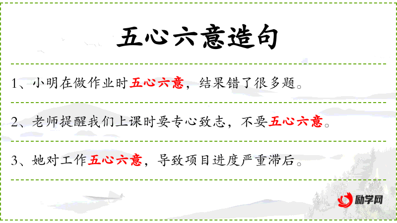 句子:“考试时五心六意会影响成绩,所以我们要集中注意力。”