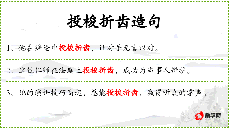 句子:“他在辩论赛中投梭折齿,帮助团队赢得了比赛。”