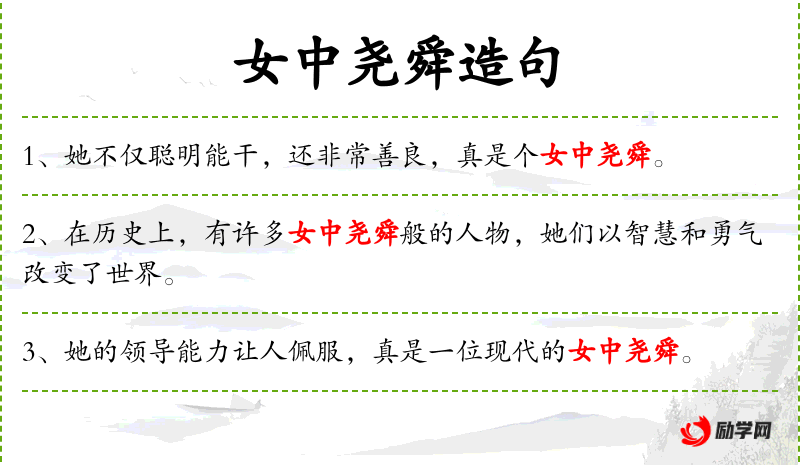 - 女中尧舜:成语,比喻女性中的杰出人物,源自古代传说中的尧舜,两位贤明的君主。