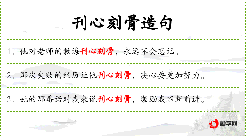 - 刊心刻骨:成语,形容感受深刻,难以忘怀。