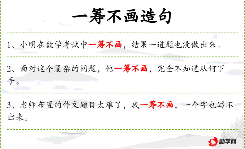 1. 【一筹不画】 - 筹:筹划、计谋。一点计策也施展不出,一点办法也想不出来。