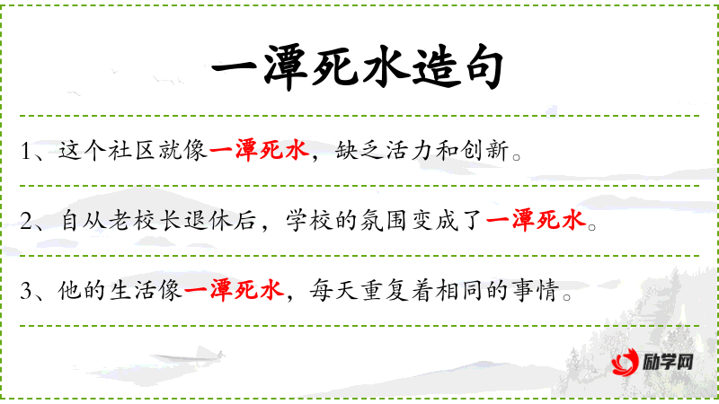 1. 【一潭死水】 潭:深水坑。一池子死水。比喻停滞不前的沉闷局面。