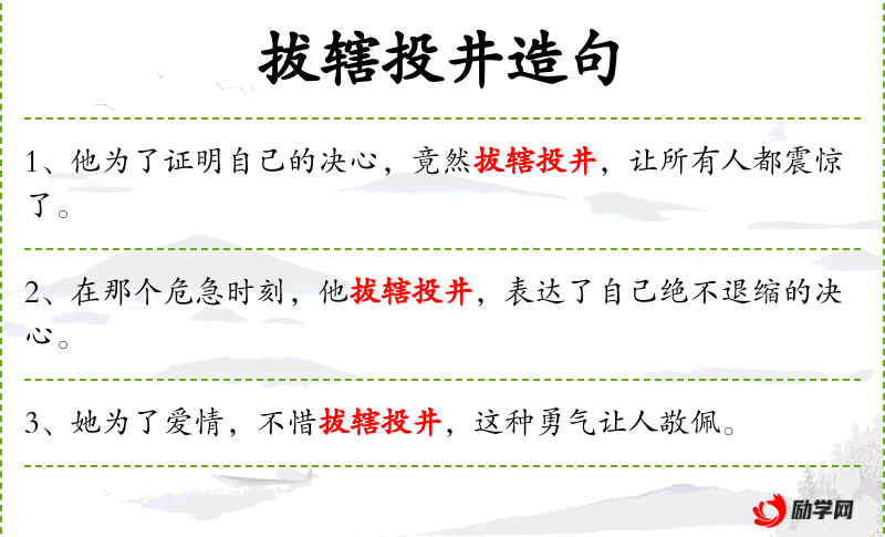 句子:“她为了爱情,不惜拔辖投井,这种勇气让人敬佩。”