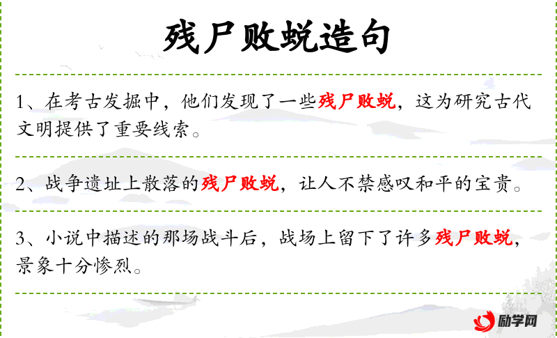 5. 【残尸败蜕】 残:破损的;败:败坏了的;蜕:昆虫脱的皮。残损的尸体,败坏了的躯壳。形容腐烂的骸骨。