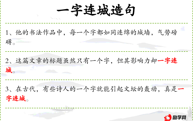 - 一字连城:这个成语源自**传统文化,用来形容书法或文字的连贯性和坚固性。