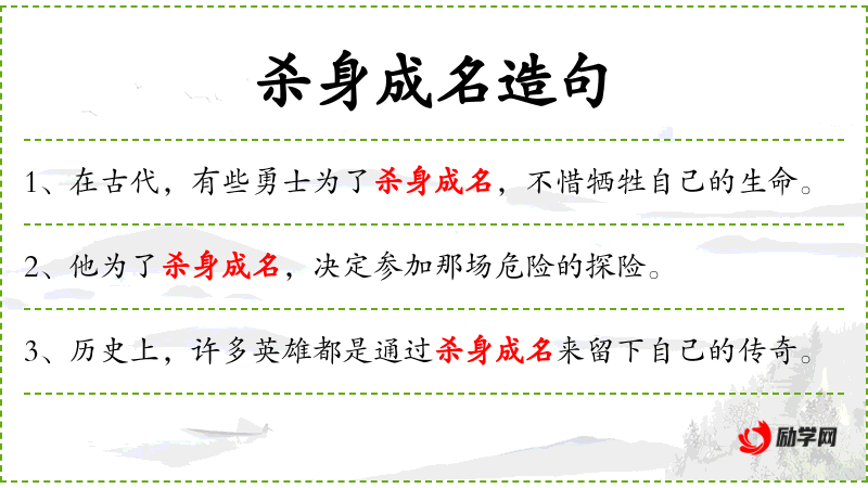 3. 【杀身成名】 为正义捐弃生命而赢得美名。