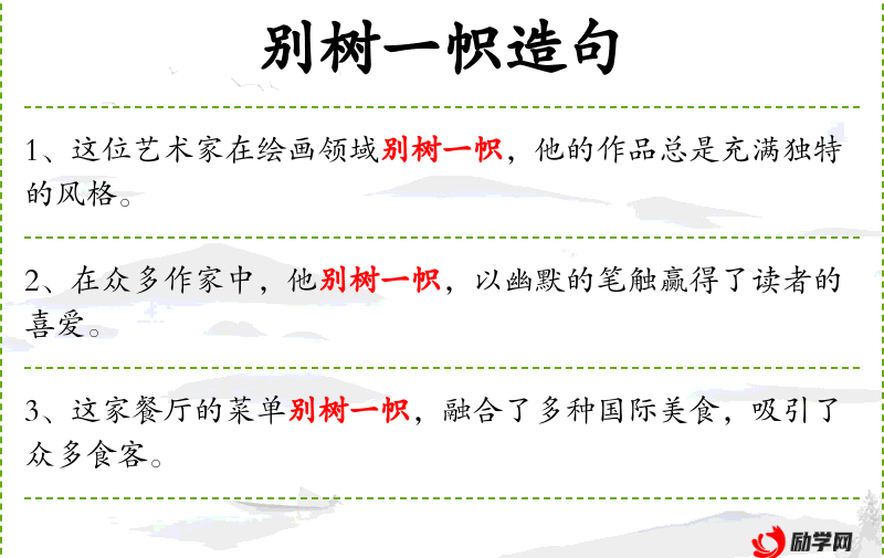 - 别树一帜:形容与众不同,独创一格。