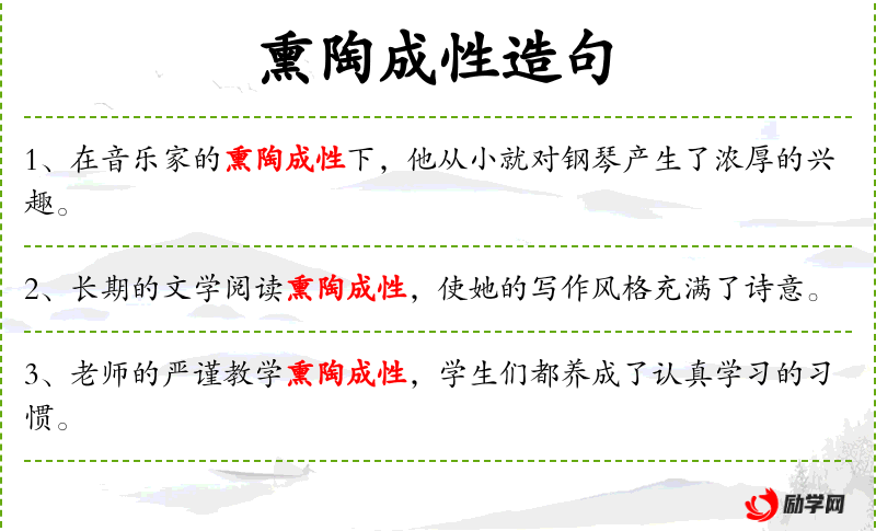 2. 【熏陶成性】 - 熏陶:感化,培养;性:习惯。经常受到某方面的感染而形成的某种习性。