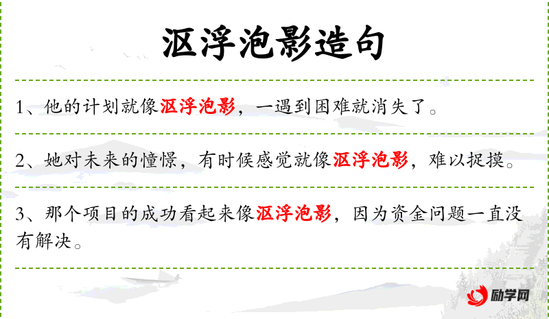 1. 【沤浮泡影】 - 水中气泡。比喻容易消失的事物。