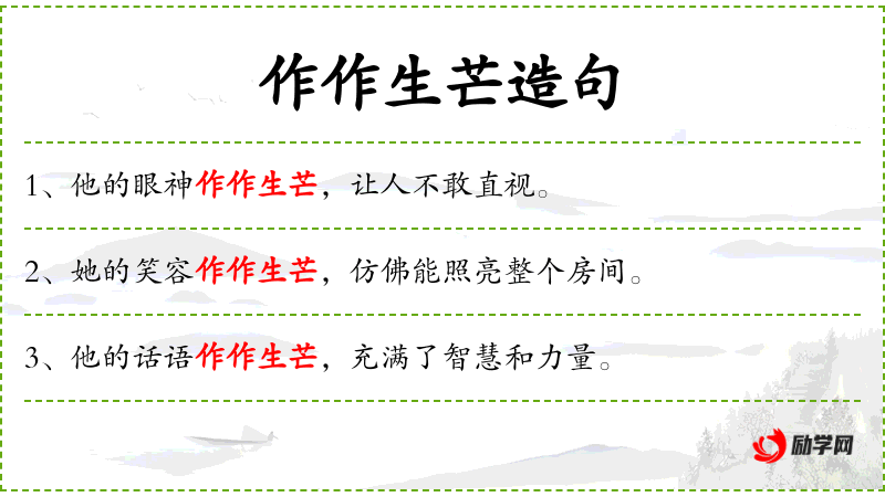 - 成语典故:“作作生芒”可能源自对自然现象的观察,比喻事物尖锐、有力。