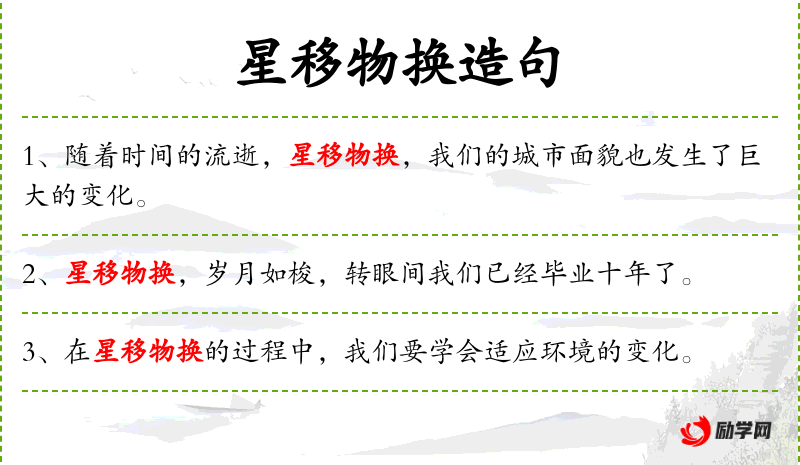 - 星移物换:比喻时间的推移和事物的变化。
