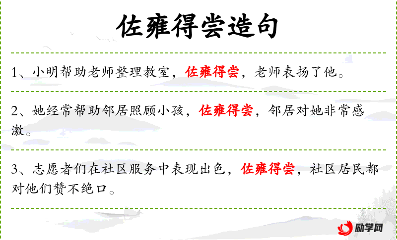 - 佐雍得尝:成语,意为“帮助别人,自己也得到好处”。