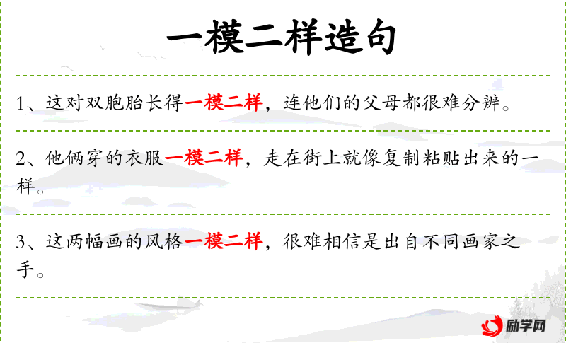 1. 【一模二样】 - 犹言一模一样。样子完全相同。