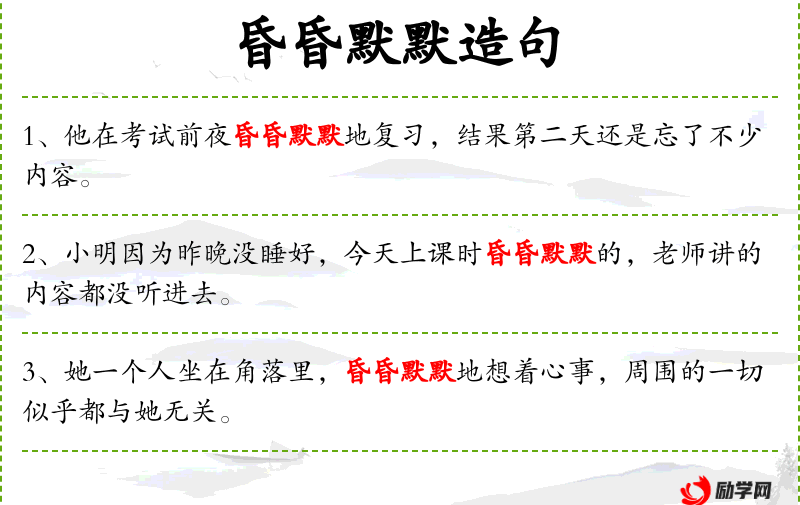 - 昏昏默默:副词,形容词,表示状态模糊或不清晰。